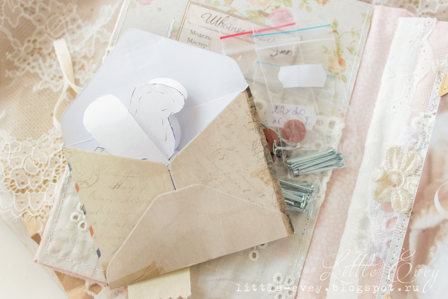 Справа захотелось разместить небольшой бумажный конвертик, где можно будет хранить различные мелочи вроде пуговок, пришитых к палетке, бирочек, визиток и другого.